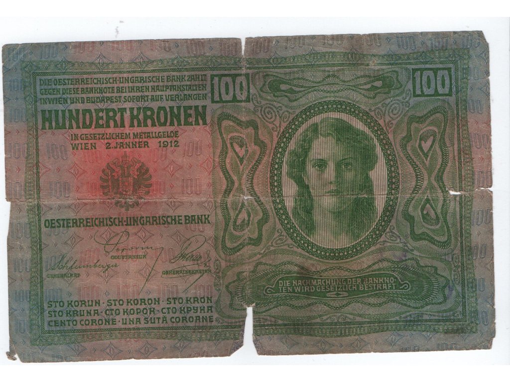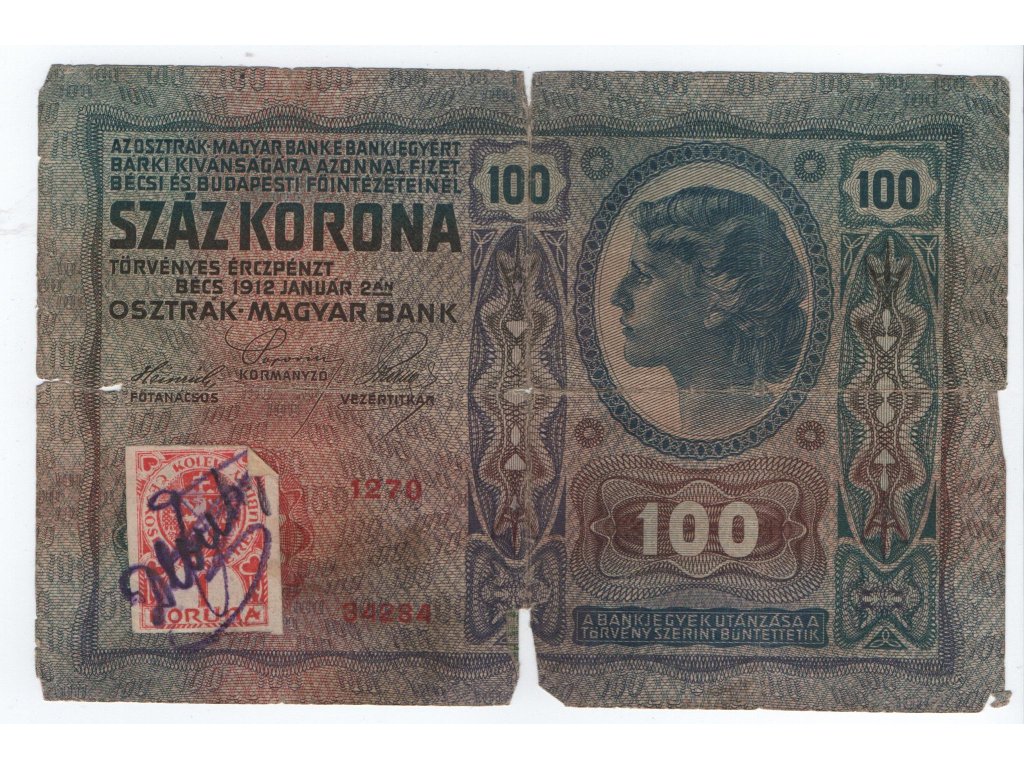 Bankovka 100 Korona 1912 s zachyteným falošným strihaným kolkom, zaujímavosť. Stav 5-