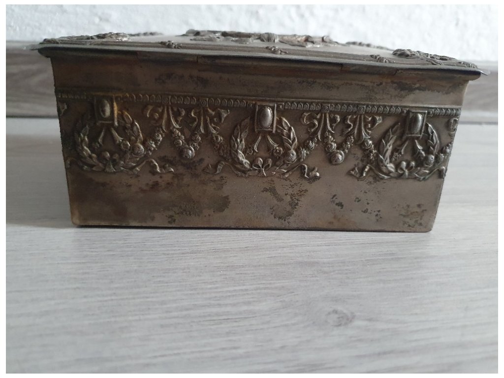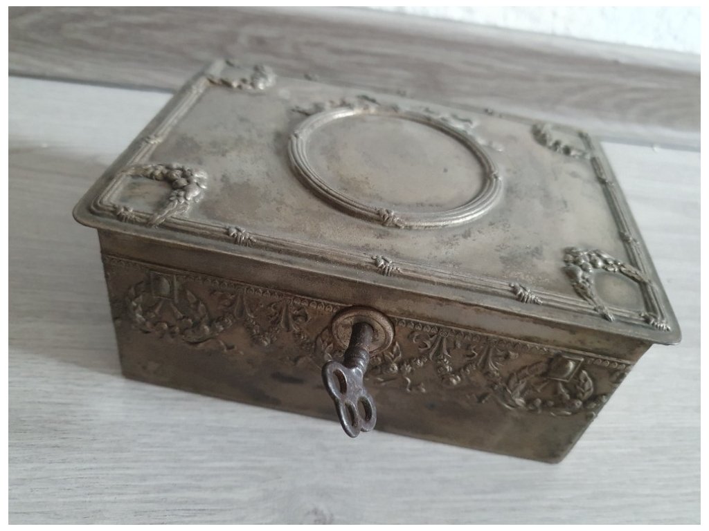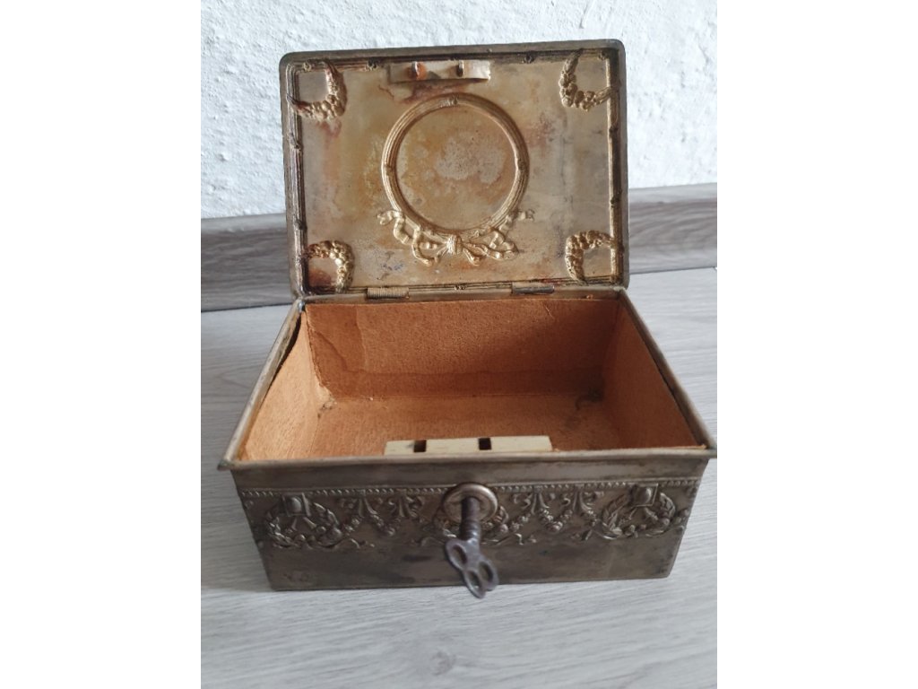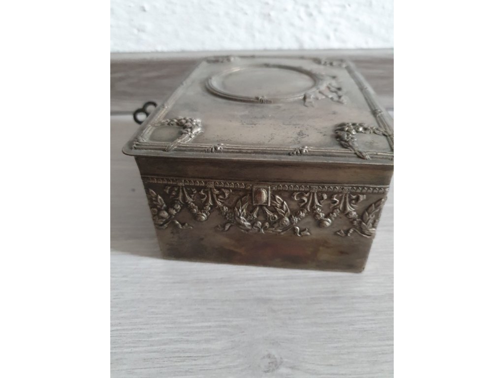 Stará alpaková kazeta so zámkom a kľúčom, uzamykanie funguje. Rozmery 15cm x 11cm x 6cm.